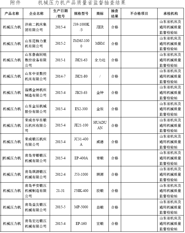 13日,山東省質(zhì)量技術(shù)監(jiān)督局在其官網(wǎng)公布2015年第2批機(jī)械壓力機(jī)產(chǎn)品質(zhì)量省監(jiān)督抽查結(jié)果,有5家企業(yè)的5批次產(chǎn)品不符合相關(guān)標(biāo)準(zhǔn)的要求。